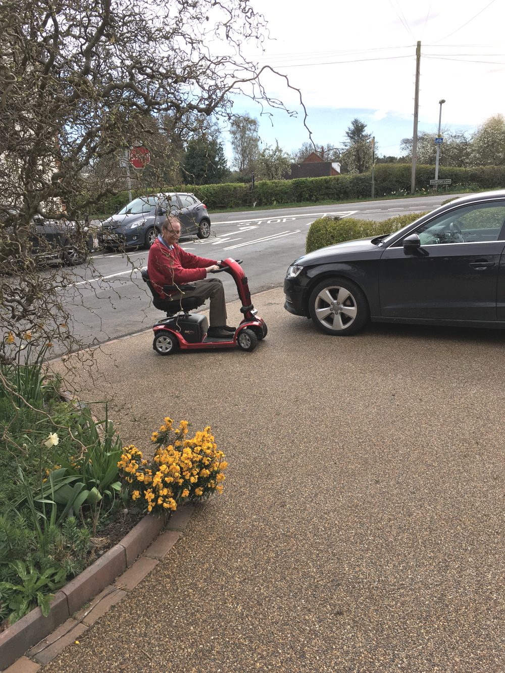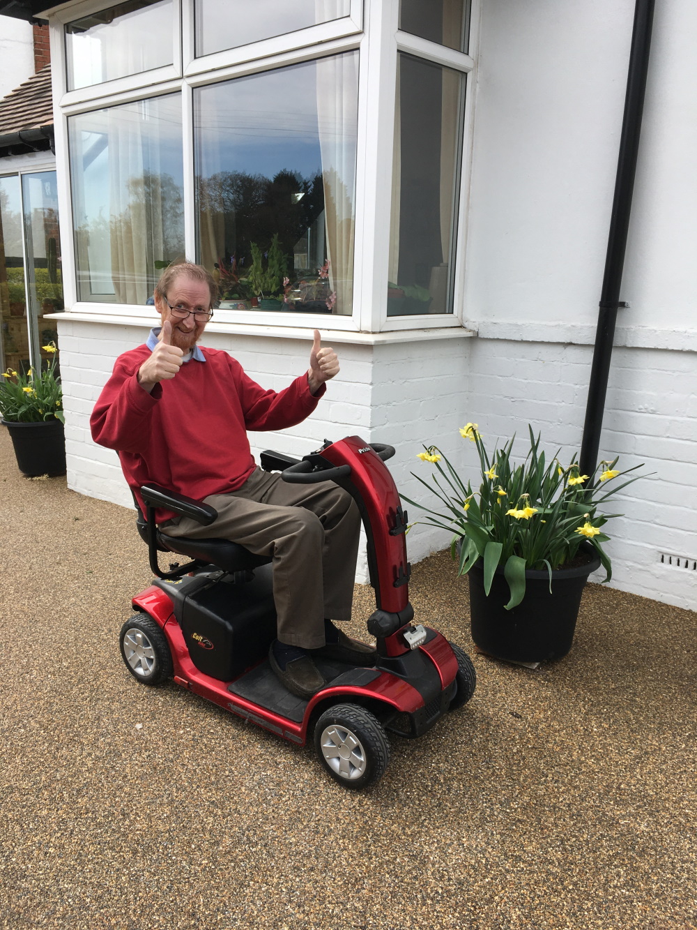 The final few weeks were spent at home where his brother in law, Alan delivered a red mobility scooter. Rob took the opportunity of fine warm weather to ride along Bickenhill Lane on his ‘Red Peril’ or ‘Red Avenger’, observing appropriate distancing, and chatting with neighbours and others on their daily exercise walks.